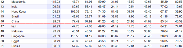 在亞洲國家中,日本(16)和韓國(21)的排名比較靠前,還有會讓很多國人不服氣的是,印度(43)、墨西哥(39)都超過了大陸的生活質量排名。