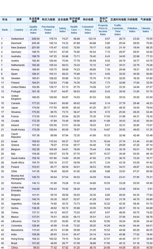 從表格中可以看出,生活質量排在前15名的國家分別有瑞士、丹麥、新西蘭、德國、澳大利亞、奧地利、荷蘭、挪威、西班牙、瑞典、芬蘭、美國、葡萄牙、英國、加拿大,而 中國排在46位,從數據圖上來看,之所以排名靠后,是有幾項指標與其他國家差距較大:污染指數偏高(85.54,僅低于埃及96.05),同時房地產收入 比指數較高(24.98,指數較低的是美國和南非,分別是3.37和3.34),購買力指數偏低(77.42,排名第1位的瑞士為178.74)。不過, 好的方面是安全指數和醫療保健指數較高,物價指數較低。