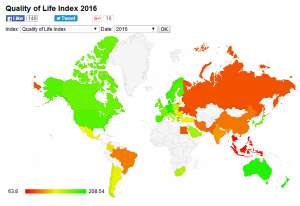 下圖是生活質量指數的世界分布,顏色越深說明生活質量越差,越偏向綠色的生活質量越高,灰色的國家地區沒有統計數據。