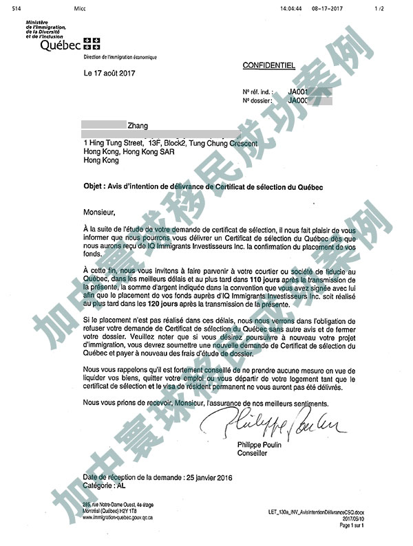 2017年8月18日,加拿大移民魁省項目,張先生免面試通過打款