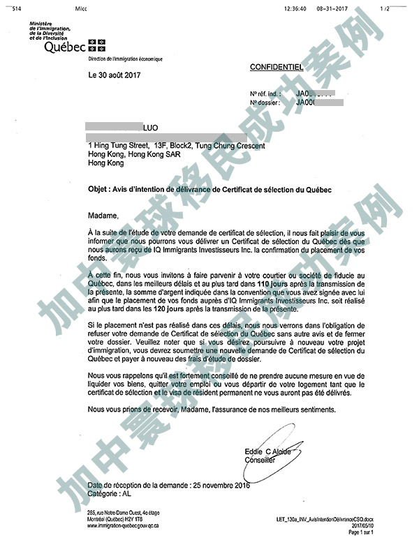 2017年8月31日,加拿大移民魁省項目,羅女士免面試通過信