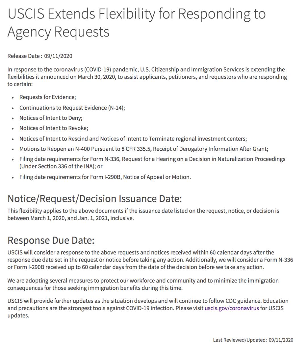 9月11日,移民局再次宣布延長補件寬限時限至2021年1月1日: