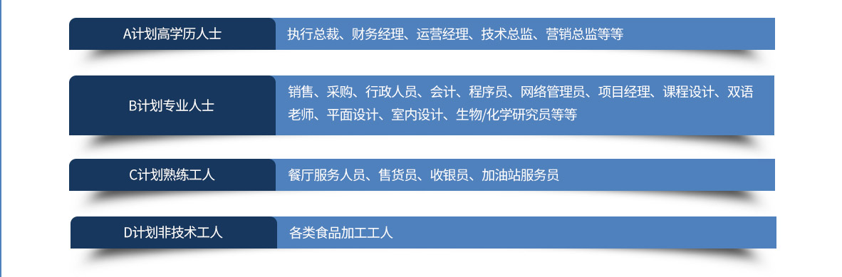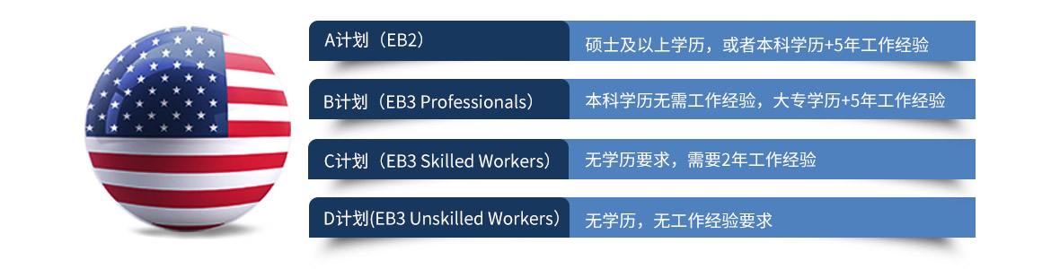 飛躍計(jì)劃介紹:包含A,B,C,D四個(gè)子計(jì)劃,對(duì)于申請(qǐng)人的學(xué)歷要求從高到低,幾乎覆蓋了全部行業(yè)全部人群。項(xiàng)目核心是申請(qǐng)人獲得美國合格雇主提供永久性工作的承諾(Permanent Job Offer)和申請(qǐng)勞工證, 由該美國雇主進(jìn)行擔(dān)保,進(jìn)而申請(qǐng)美國的合法永久居住權(quán)。