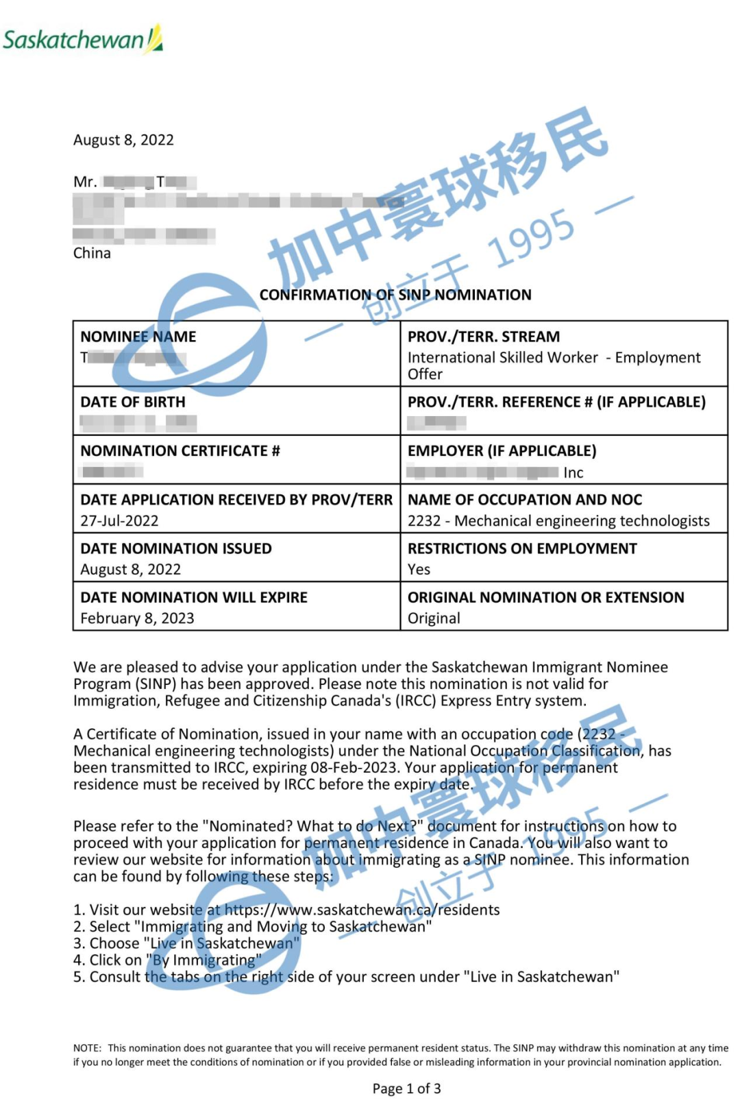 加中寰球客戶T先生(采暖、通風(fēng)及空調(diào)技師)申請(qǐng)加拿大薩省雇主擔(dān)保移民項(xiàng)目,于2022年8月8日省提名獲批,用時(shí)僅12天! 有關(guān)詳情如下: