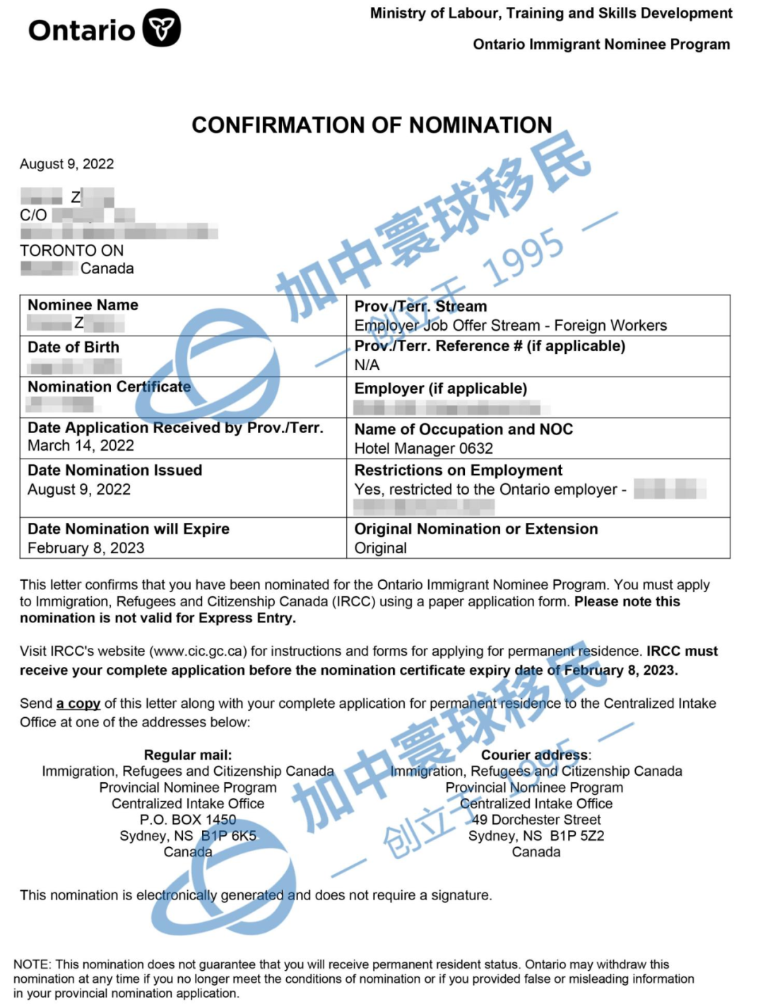 加中寰球移民客戶Z先生(酒店經(jīng)理)申請加拿大安省雇主擔(dān)保移民,于2022年8月9日省提名獲批! 有關(guān)詳情如下: