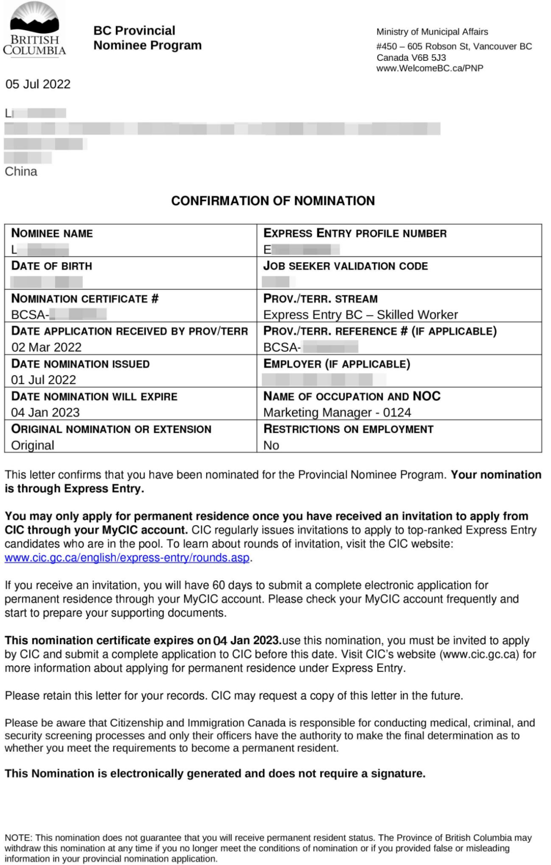 加中寰球BC省雇主資源豐富,很快幫L女士匹配到了大溫地區一家與其工作經驗完全符合的營銷經理一職,順利通過面試并收到Job Offer后,我們專業的文案及律師團隊便開始為L女士準備全面詳細的文件,快速入池EOI待選。2022年2月8日,L女士順利獲邀,中間經歷過一次補件,4個月省提名順利獲批!