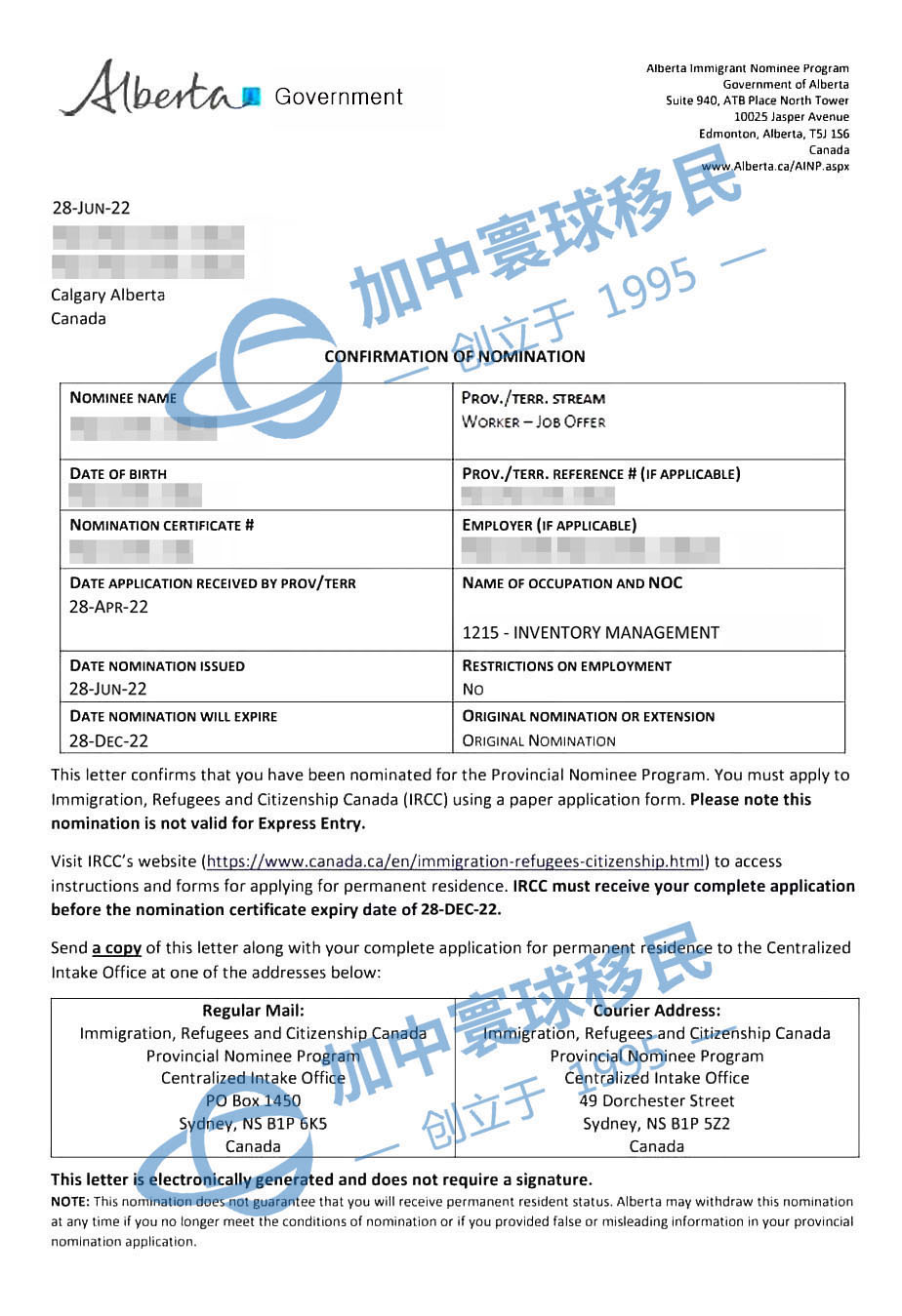 加中寰球客戶Z先生(庫存管理人員)申請加拿大阿省雇主擔保移民,省提名于2022年6月28日獲批,用時2個月!有關(guān)詳情如下: