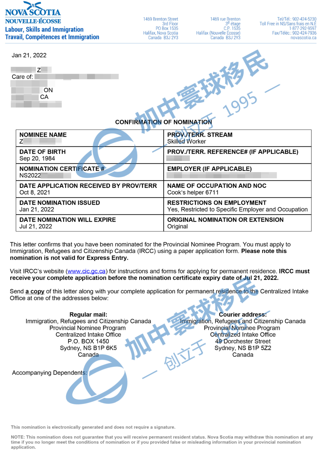 加中寰球客戶Z先生(餐廳幫廚)申請NS省雇主擔保,省提名于2022年1月21日成功獲批!有關詳情如下: