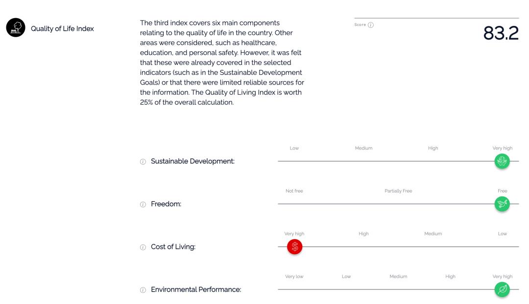 從三個方面分別來看,加拿大生活質量指數方面的排名位列全球第四位,屬于適宜遷居生活的國家。加拿大的環境可持續性、生活成本、基礎設施、個人及政治自由等方面表現突出。這說明加拿大是全球最友好的移民國家之一。
