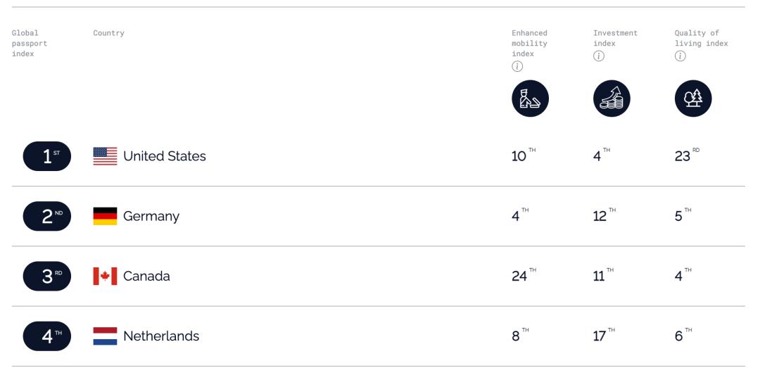在綜合排名方面,全球護照實力最強的國家是美國,緊接著是德國,第三即為加拿大。