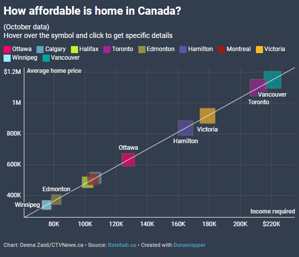 從Ratehub.ca收集的數據顯示,維多利亞州 (Victoria)10 月份的收入和平均房價降幅最大。維多利亞9月份的房屋均價為$915,300,壓力測試利率為7.44%,抵押貸款利率為5.44%。維多利亞10 月份購房者需要至少$178,890加元的年收入,才有資格獲得平均價位房屋的抵押貸款,首付款為20%。