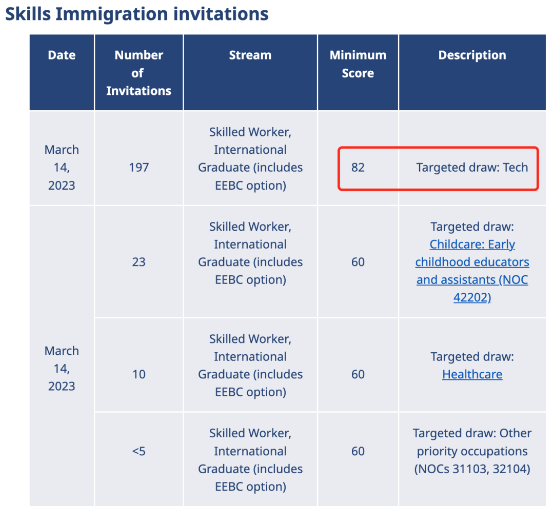 現(xiàn)如今BC省常規(guī)通道持續(xù)居高不下的狀態(tài),如果背景履歷在BC Tech 35個崗位清單中,簡直太幸運(yùn)了!3月14日,BC Tech類邀請了197人,最低分?jǐn)?shù)線82分。