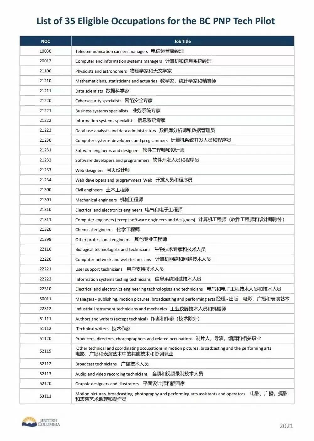 職位:獲得一年工作時間的BC省內(nèi)的雇主offer,如果要走【BCPNP Tech】,需要滿足該項(xiàng)目列表中的35個職位要求;