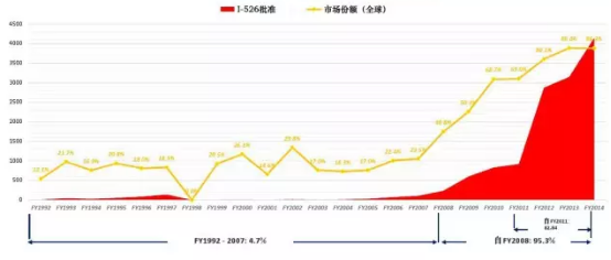 自1992財政年起,中國大陸貢獻了超過67億美金的EB-5外國直接投資(FDI)。另外, 95%的中國大陸EB-5投資人的I-526批準發生在2008財政年后,82%的I-526批準發生在最近的四個財政年內。下圖顯示,中國大陸的EB-5市場份額從2008財政年的38%增長到2014財政年的超過86%。
