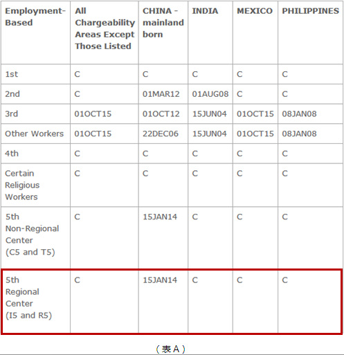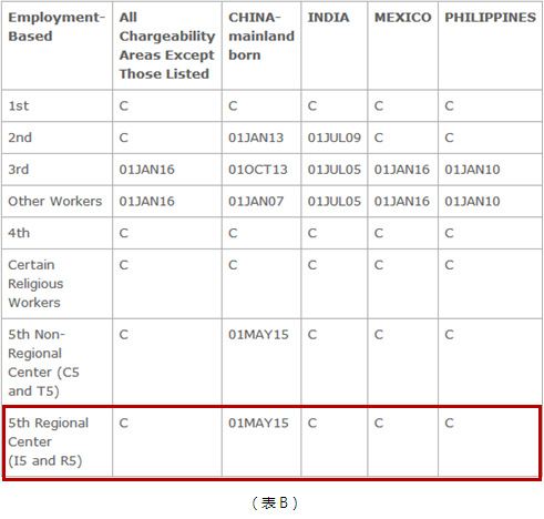 表B中的排期日沒有變化,依舊是2015年5月1日。但根據移民局官網的提示,投資人目前還無法根據表B的排期遞交I-485。