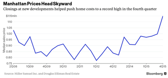 2015年第四季度,曼哈頓整體房價飆升至紀錄高點。在全球經濟陷入低迷之后,海外買家尤其是中國大陸和香港的買家為紐約房價上漲做出了貢獻。
