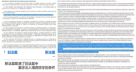 | 舊法案 | 在法律條款(66.2.b)中規(guī)定:為獲得居留,投資者需在授權(quán)要求的期限內(nèi)至少登錄西班牙 一次 |