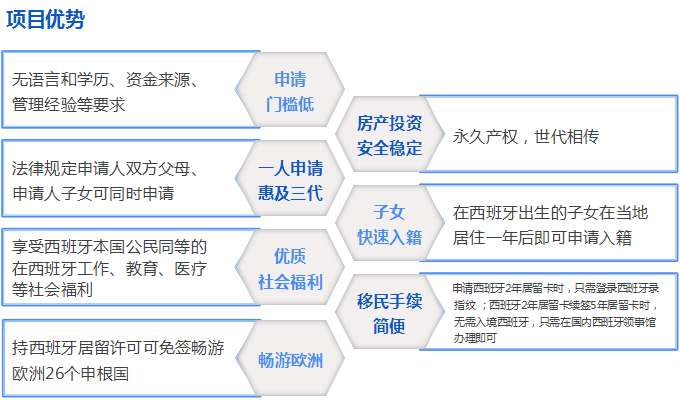 | 解說(shuō) | 1、投資人不需要出入境西班牙即可申請(qǐng)或續(xù)簽居留證件,除此之外,新法案還指出首次 居留簽證為兩年期滿后可直接轉(zhuǎn)為五年可換居留,新法減化了申請(qǐng)和續(xù)簽手續(xù),為投資者 帶來(lái)極大便利。 2、新法更改了舊法中一些不利于海外投資者的條例,由此可見西班牙對(duì)于移民者依然持 非常歡迎的態(tài)度。 |
