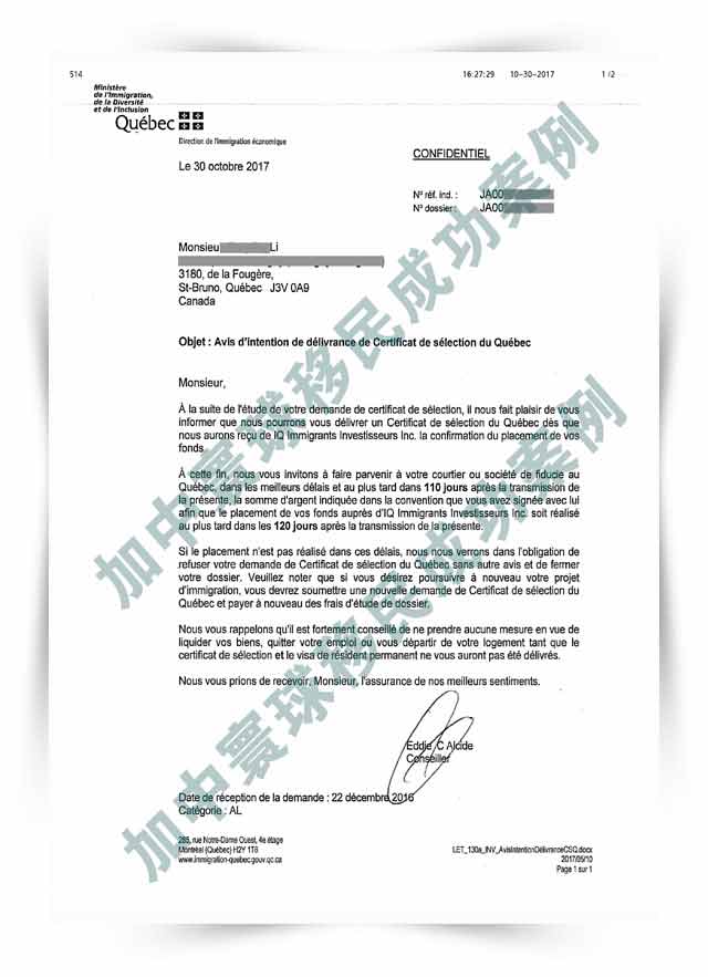 2017年11月1日,恭喜黎先生收到魁省免面試通知!
