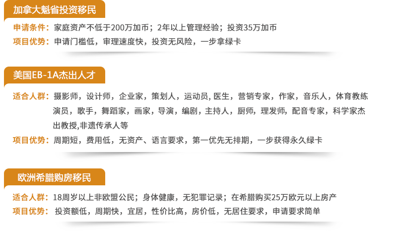 加拿大:加拿大:魁省投資移民,2018年搶占配額全面開啟,35萬加幣全家移民,現場深度解析。 美 國:EB5遙遙無期,EB-1A杰出人才項目美國大受歡迎,適合60%投資移民客戶,各個各業人士均可申請,移民局獲批最快只要15天。 希 臘:25萬歐元購房移民,一人申請三代移民,購房可包租,全球最新一手房源現場展示,預約考察有好禮。