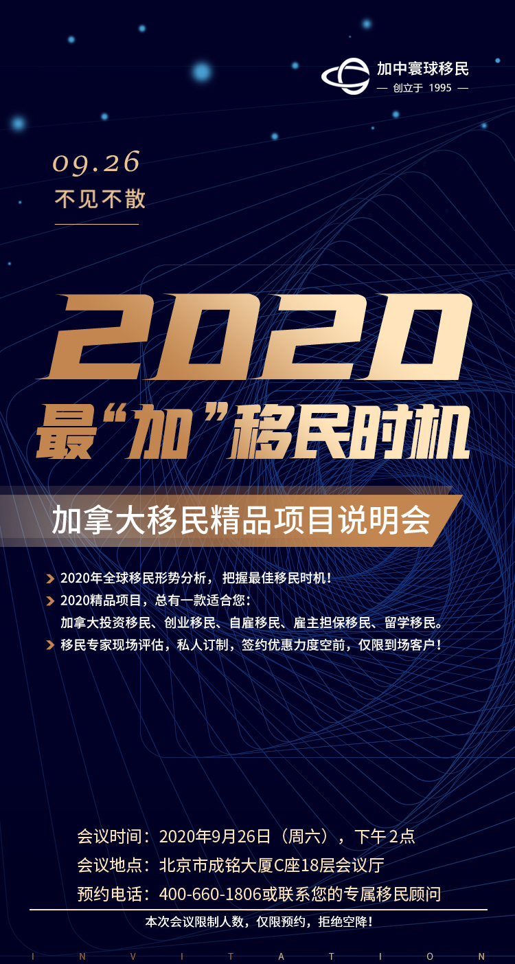 那么,加拿大到底適合什么樣的人移民?有哪些熱門移民項目?對申請人有哪些要求?如何把握2020加拿大最佳移民時機?帶這些問題,加中寰球將于2020年9月26日舉辦加拿大精品移民項目說明會。屆時,加中寰球將集中移民專家最強陣容,給予您最權威、最詳盡的解答!