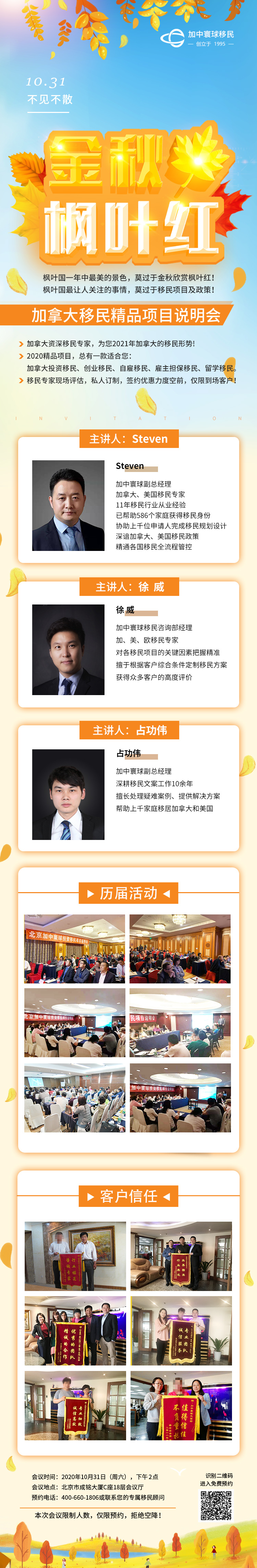 2020年10月31日,加中寰球再次舉辦加拿大精品移民項目說明會。屆時,加中寰球副總經理郝順心先生將攜咨詢部、項目部、文案部資深移民專家組成的最強陣容,對加拿大自雇移民、投資移民、創(chuàng)業(yè)移民、雇主擔保、留學移民、團聚移民等項目進行最權威解讀,對全球移民形勢作精準分析,給您的正確決策提供最科學的依據!簽約還有神秘大禮相送!相信一定讓您不虛此行!
