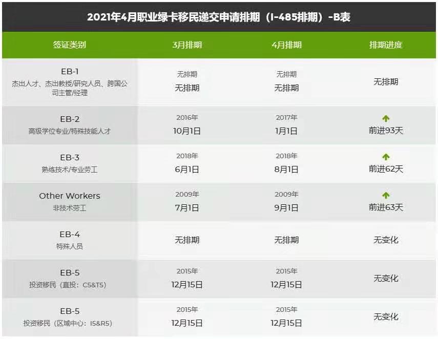 美國移民排期2021年4月綠卡排期公布:職業移民第一優先類別EB-1(包括EB-1A杰出人才移民和EB-1C跨國公司高管移民)重回無排期時代!EB-1A杰出人才移民和EB-1C跨國公司高管移民迎來最佳移民申請時機!