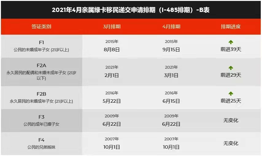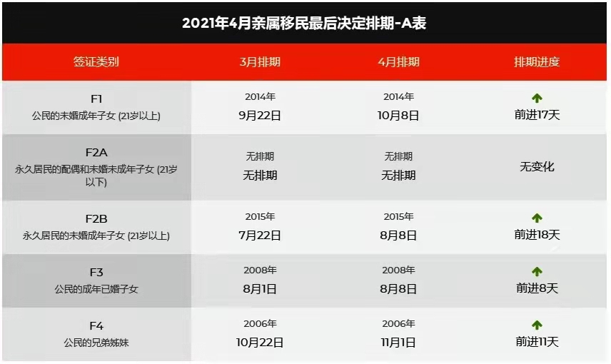 親屬移民前進緩慢,F1 公民未婚成年子女前進17天,F2B 永久居民未婚成年子女前進18天,F3 公民已婚成年子女前進8天,F4 公民兄弟姐妹前進11天。
