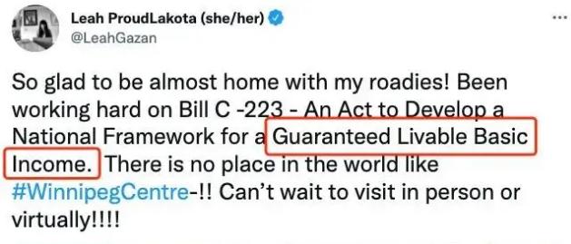 提出法案的新民主黨國會議員Leah Gazan稱:保證基本收入是這個國家的一個政治選擇,讓我們停止支持公司,投資于個人。