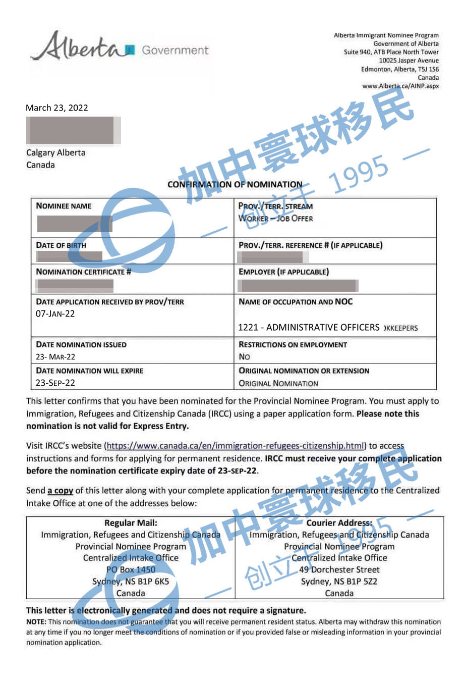 2022323,C女士,44周,行政人員,省提名2個(gè)阿省雇主擔(dān)保省提名成功獲批。有關(guān)詳情如下