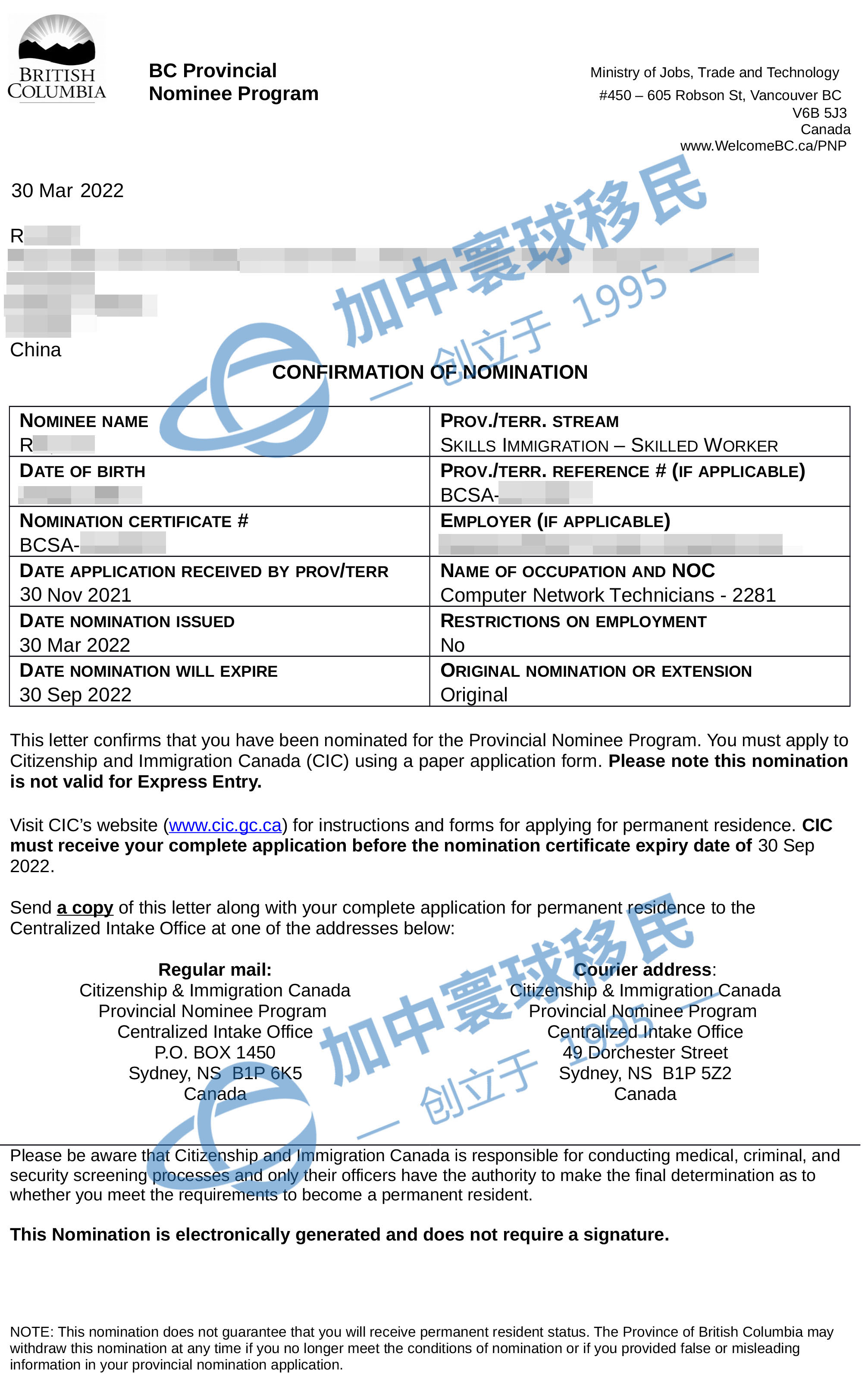 加中寰球BC省雇主資源豐富,很快幫R先生匹配到了大溫地區(qū)一家IT公司網(wǎng)絡(luò)管理員職位。R先生順利收到Job Offer后,我們專(zhuān)業(yè)的文案及律師團(tuán)隊(duì)便開(kāi)始為R先生準(zhǔn)備全面詳細(xì)的文件,快速入池EOI篩選池待選。2021年11月16日,R先生順利獲邀,兩周內(nèi)我們幫R先生遞交了省提名申請(qǐng)文件,三個(gè)月省提名順利獲批!
