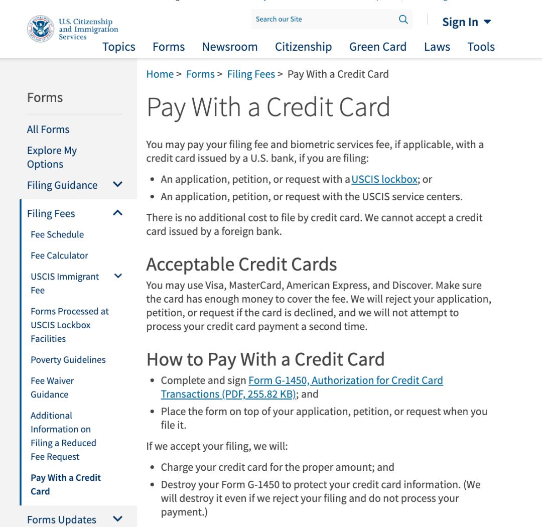 作為信用卡支付試點計劃的一部分,移民局服務中心現在接受申請者填寫G-1450表格(信用卡交易授權表格)進行信用卡支付。申請人填寫G-1450表格后,就可以使用信用卡支付申請費了。