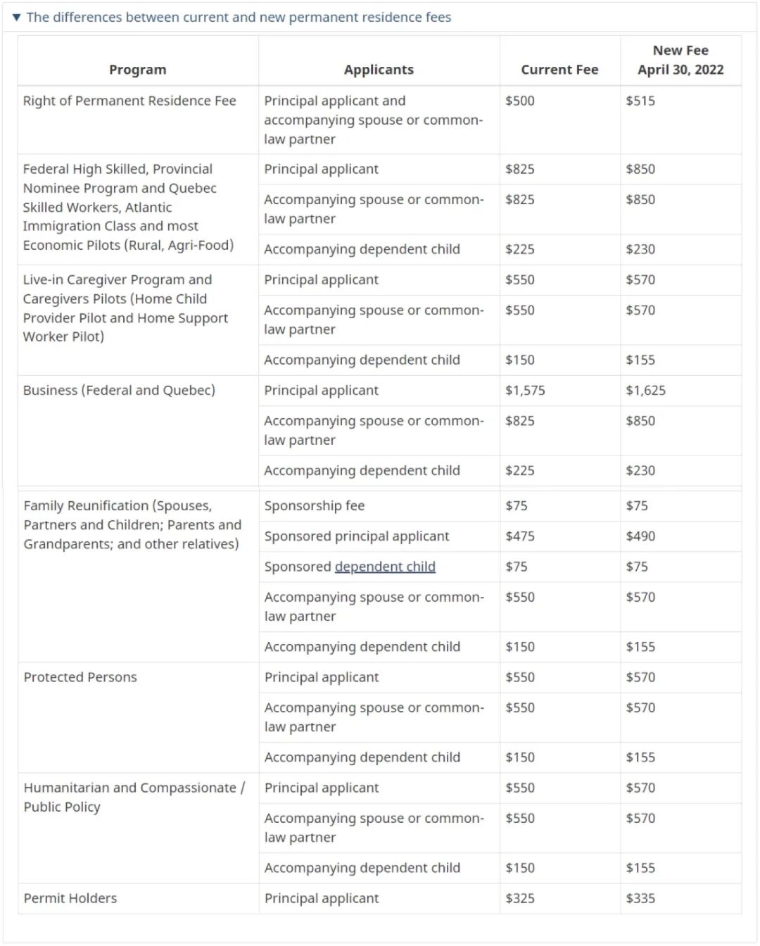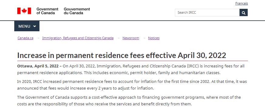 2022年4月5日,加拿大移民難民及公民部(IRCC)公布了加拿大移民申請費用的微調法案,并且明確指出未來的申請費每兩年上漲一次,以應對長期的通貨膨脹。下次費用增長預計在2024年。