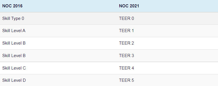 11 月 16 日,IRCC 推出了 NOC 2021,新系統根據所涉及的training、education、experience和responsibility (TEER) 對職業進行分類。新的 TEER 系統修改了 NOC 2016 的技能等級 0-E,并創建了等效的 5 個 TEERS。