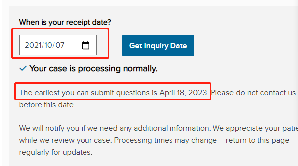 此外,選擇表格、表格類別及審理中心,按“Get Processing Times”,查詢到案件審理時間后,下方還有“何時才可以提交查詢”的按鈕,輸入移民局收件日期即可查詢,例: