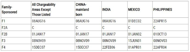 F1類(公民的成年未婚子女)原地踏步;F2A類(永久居民的配偶及未成年子女)無需排期,有名額;F2B類(永久居民的成年未婚子女<21歲及以上>)原地踏步;F3類(公民已婚子女)原地踏步;F4類(成年公民的兄弟姐妹)原地踏步。