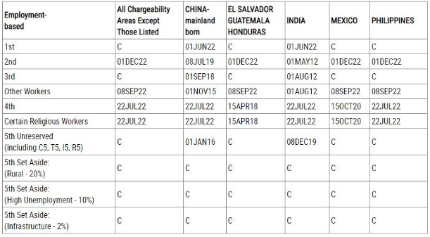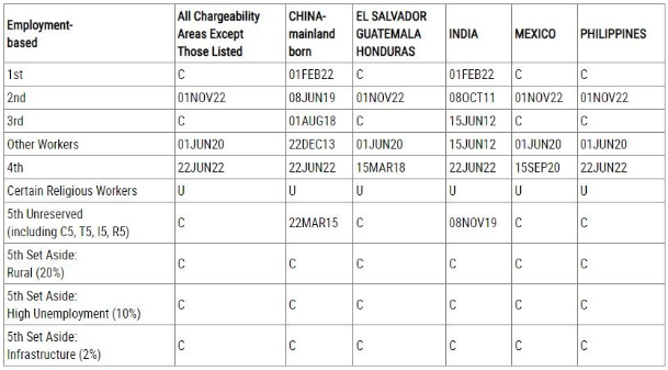 EB-1(杰出人才)出現排期;EB-2(高等學位專業人才)原地踏步;EB-3(技術類專業勞工)原地踏步;非技術勞工原地踏步;EB-4(特殊人員)原地踏步;EB-5(直投和區域中心)原地踏步;EB-5(農村項目)無須排期,有名額;EB-5(高失業率項目)無須排期,有名額;EB-5(基建項目)無須排期,有名額。