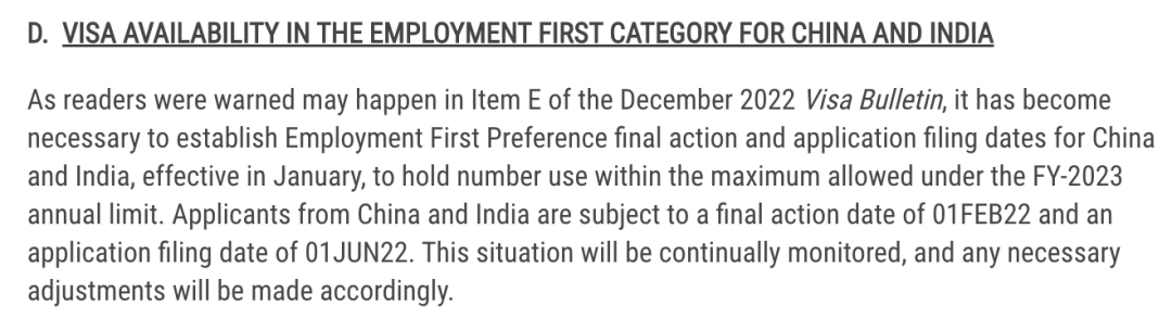 鑒于當前中國和印度的EB-1申請數量激增,從2023年1月開始EB-1雙表均出現排期:表A排期為2022年2月1日,表B排期為2022年6月1日。