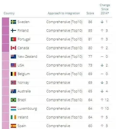 其中,加拿大憑借著全面、友好的移民政策,對新移民的平等權利、機會和安全程度,成功從五個大洲、五十二個國家中脫穎而出,以80分的高分位居全球第四!