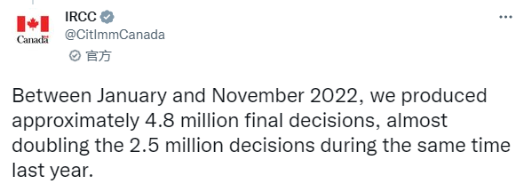 加拿大移民部部長也強調了今年移民局在申請處理方面取得了破紀錄的進展。自8月以來,移民部已減少了近50萬份申請。截至11月底,移民部處理了大約480萬份申請,幾乎是去年同期處理申請數量的兩倍。