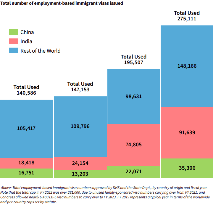其中移民局和移民審查執(zhí)行辦公室EOIR共批準(zhǔn)了220,000多份針對(duì)人已經(jīng)在美國(guó)的、提交了I-485身份轉(zhuǎn)換的職業(yè)移民綠卡申請(qǐng)。2022年簽發(fā)的職業(yè)移民綠卡數(shù)量是疫情前的2倍。