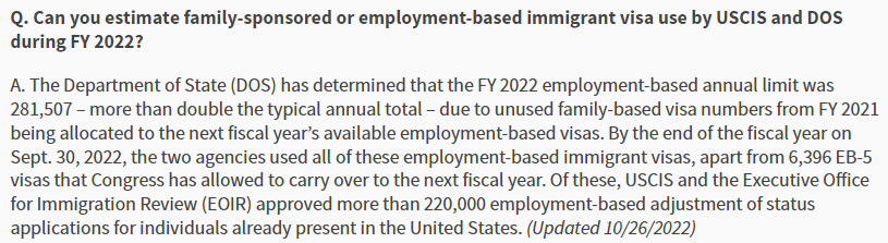 此外,根據(jù)2022年10月16日移民局官方數(shù)據(jù),截止2022年9月30日2022財(cái)年結(jié)束,除了國(guó)會(huì)允許的可以被轉(zhuǎn)移到下個(gè)財(cái)年繼續(xù)使用的6,396張EB-5投資移民綠卡,美國(guó)移民局和美國(guó)國(guó)務(wù)院使用了所有2022財(cái)年被分配的職業(yè)移民綠卡配額。