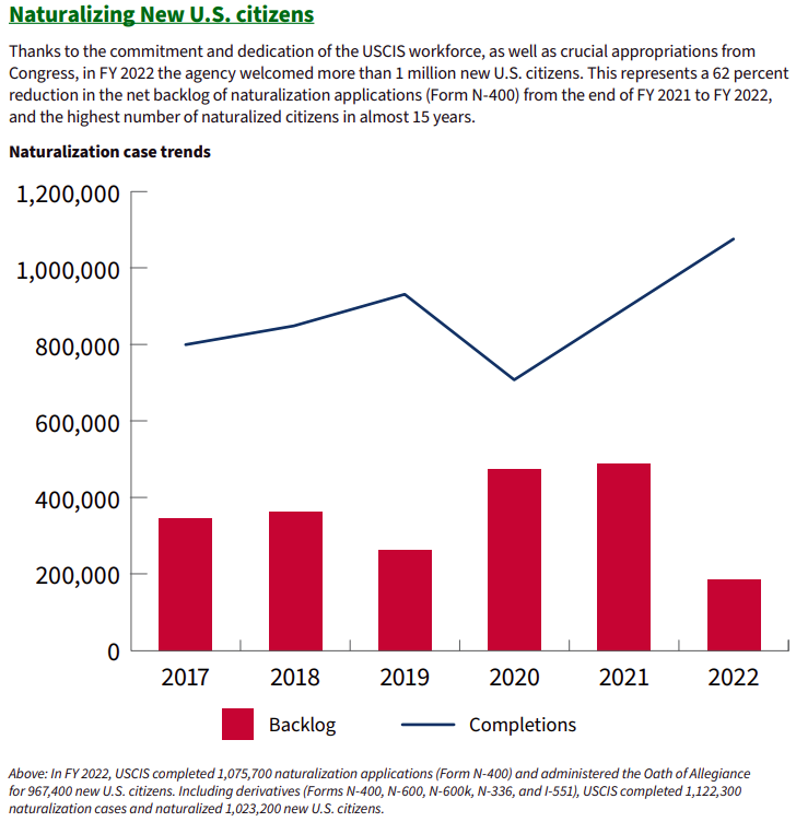 2022財(cái)年超過(guò)100萬(wàn)移民成為美國(guó)公民,這意味著從2021財(cái)年末到2022財(cái)年,入籍申請(qǐng)(N-400表格)的凈積壓減少了62%。2022財(cái)年也是近15年來(lái)歸化公民人數(shù)最多的一年。