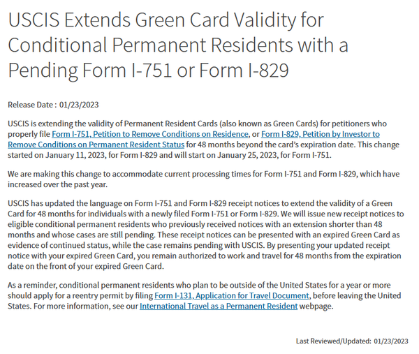 1月23日,美國移民局(USCIS)發(fā)布消息稱,USCIS正在延長正確提交I-751表《申請取消永久居民的限制條件》或I-829表《投資者申請取消永久居民的限制條件》申請人的永久居民卡(Permanent Resident Cards),也被稱為臨時綠卡的有效期,在該卡到期后自動延長48個月。
