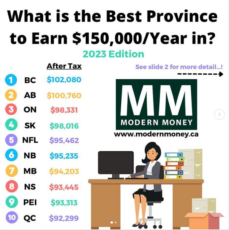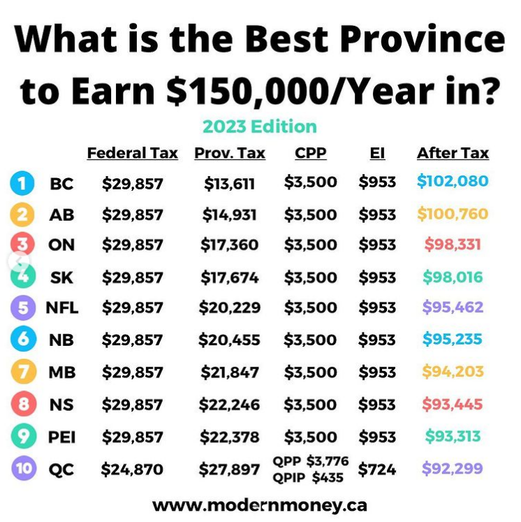 Modern Money 就以年薪15萬加幣給出了在加拿大十個省,扣除稅、CPP(養老金)和EI(就業保險)后實際的收入。
