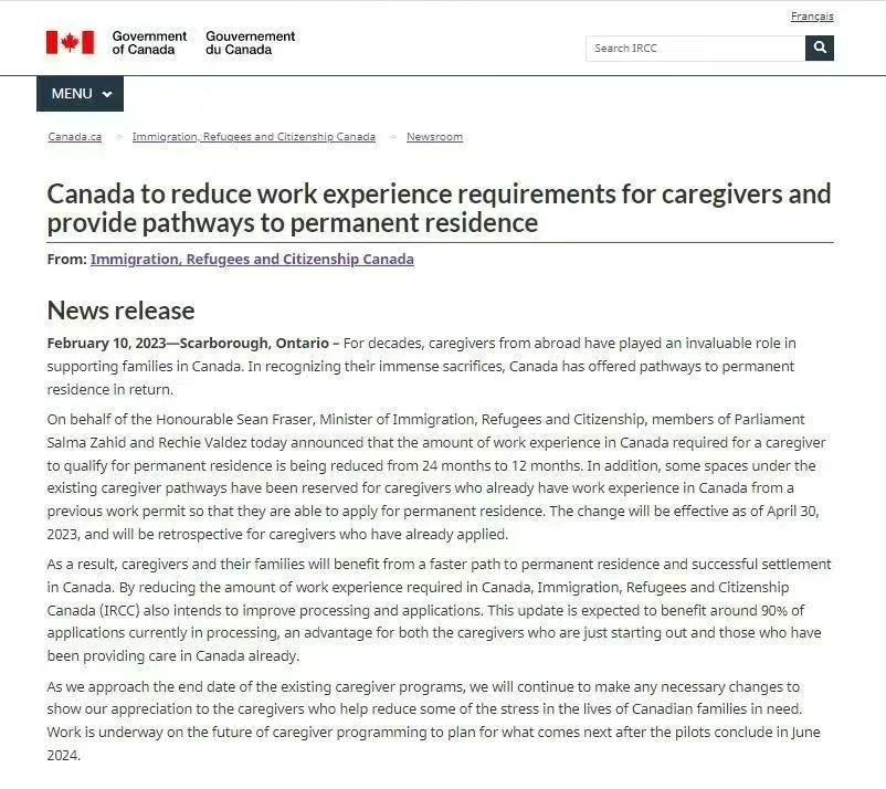 IRCC在2月10日官宣:為感謝廣大保姆護工前來加拿大工作,決定為保姆護工移民直通車試點項目再開綠燈——自2023年4月30日起保姆護工移民直通項目對申請人的工作經驗要求從24個月減少到12個月