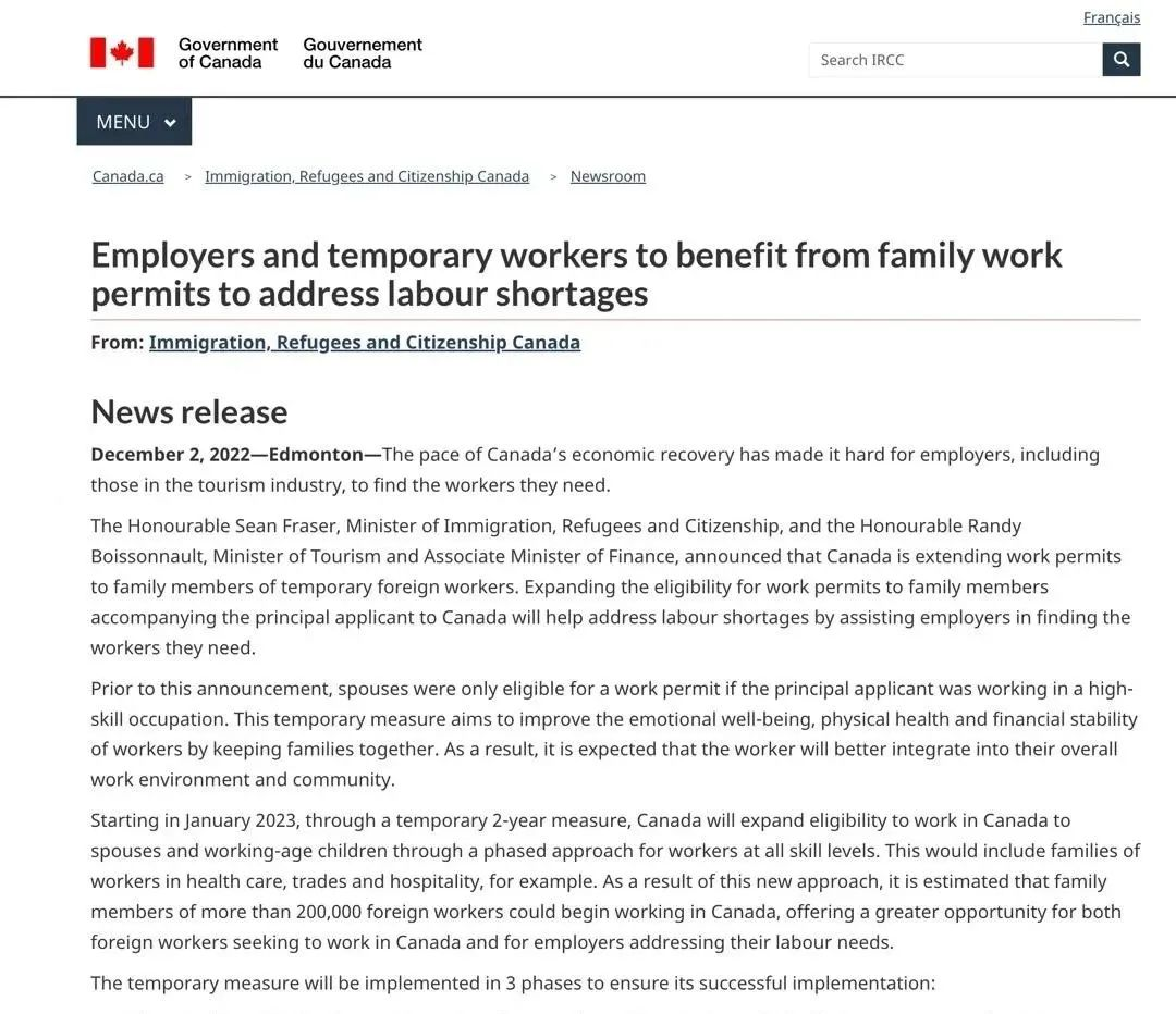 早在疫情初期,由于國際航班減少,各國入境政策也在時刻變化,有不少的短期簽證持有者滯留在加拿大。因此移民局于2020年8月24日出臺了允許游客在加拿大境內申請LMIA工作簽證的臨時政策,當時公布的政策將于2021年3月31日截止。隨后,移民局將該政策延期到2023年2月28日