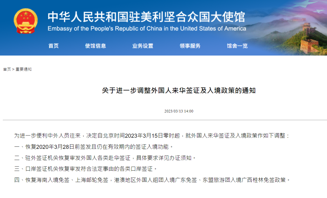 中國駐美大使館宣布:外國人來華政策重大調整,3月15日生效