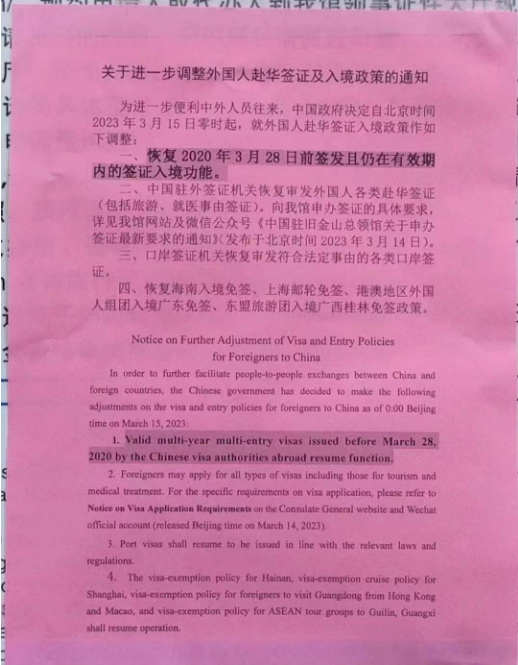 通知中指出,為進一步便利中外人員往來,決定自北京時間2023年3月15日零時起,就外國人來華簽證及入境政策作如下調整:
