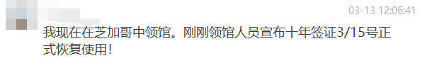 隨后,在芝加哥中領館也有最新消息。領館工作人員宣布自3月15日,舊的十年簽證正式恢復使用!